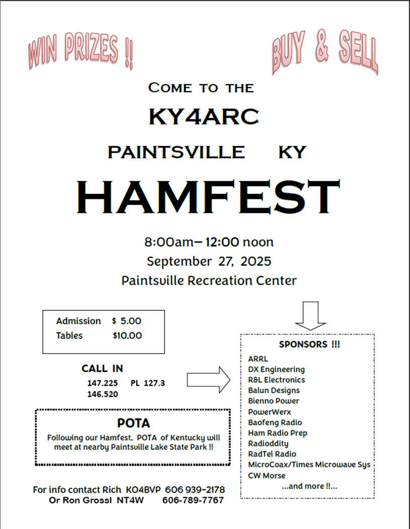 KYARCS Hamfest 2025 Just a notice to let you know that our club will be holding our annual hamfest this year on September 27th. We will again be at the Paintsville Recreation Center. We have quite a few donations for door prizes and wish to thank the sponsors. We almost entirely have James Morely (W4FIR), to thank for getting these sponsors to donate to the club. It seems he has the knack for getting the donations. Please click on the link below to view the sponsors and consider buying from these businesses by clicking on their links. There is even one sponsor that has given us a discount code to be used right now. Check it out!!!